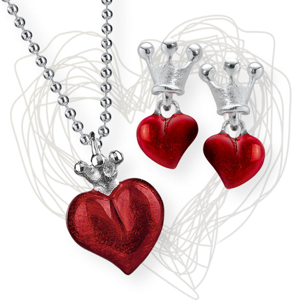 Feurig rot lodernder Brandlack auf feinstem 925 Sterling Silber bringt unser Schmuckherz so richtig zum Pochen und die teilweise beweglichen Krönchen verleihen unserem LIEBLINGSSTÜCK eine selbstbewusste Ausstrahlung, die jedes Outfit zu einem ganz besonderen Blickfang erstrahlen lässt. Das Schmuckset besteht aus Anhänger, den dazu passenden Ohrsteckern & einer zarten Kugelkette und ist nun für Dich bei uns im Onlineshop in den Monaten November und Dezember zum Vorteils-Setpreis zu finden.