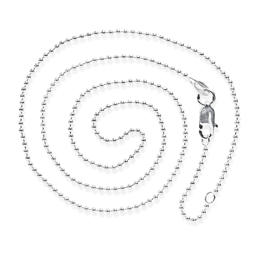 3. Einer feinen Kugelkette (Durchmesser 1,5mm) in der Länge 45 cm mit einer Zwischenöse bei 42 cm. Diese Kette ist ein Klassiker und sieht schon allein toll aus. Sie kann aber auch mit all unseren kleinen und mittleren Anhängern, als halsnahe Kette, getragen werden und sollte in keinem Schmuckkästchen fehlen.